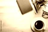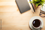 Workplace of office desk wooden table with laptop and eyeglasses and equipment other office supplies with with coffee cup and copy space, flat lay