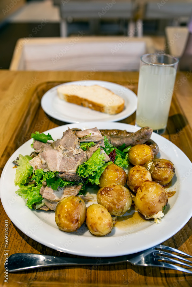 Young potato with meat and sausages. Plate with food on the table