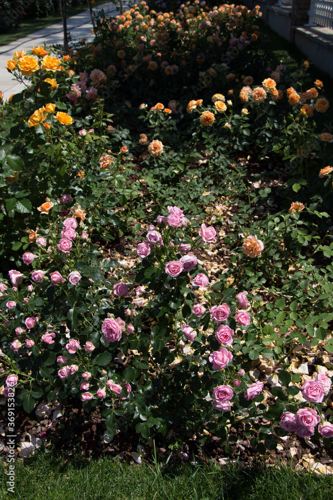 Blooming beautiful colorful roses in the garden
