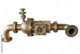 Copper brass pipeline with valves and pistons in steampunk style on white background, isolated.