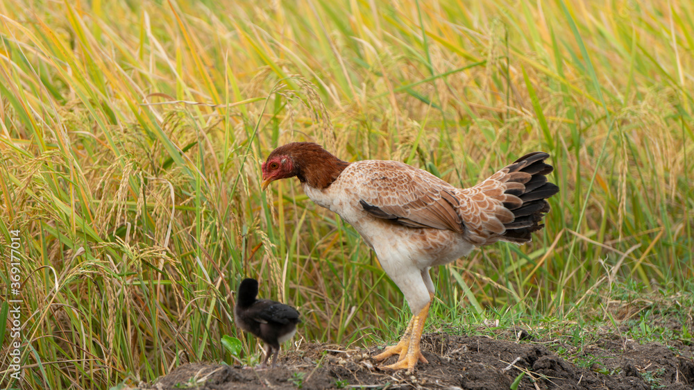 Some native chickens who are looking for food around rice fields. Free-range chicken has hard meat texture that tastes better than broilers