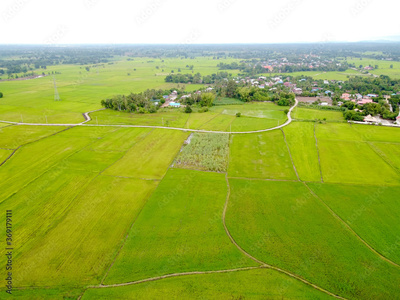 Aerial photograph, Green rice fields in rural areas, Thailand