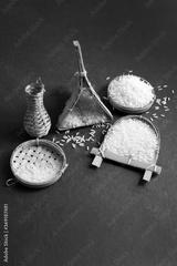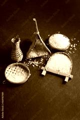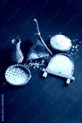 Raw rice farming. Indian kolam rice placed in an indigenous or conical basket made out of Bamboo. Traditional miniature Bamboo vessels from Meghalaya. on black background with copy space.