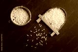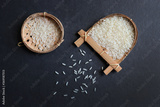 Raw rice farming. Indian kolam rice placed in an indigenous or conical basket made out of Bamboo. Traditional miniature Bamboo vessels from Meghalaya. on black background with copy space.