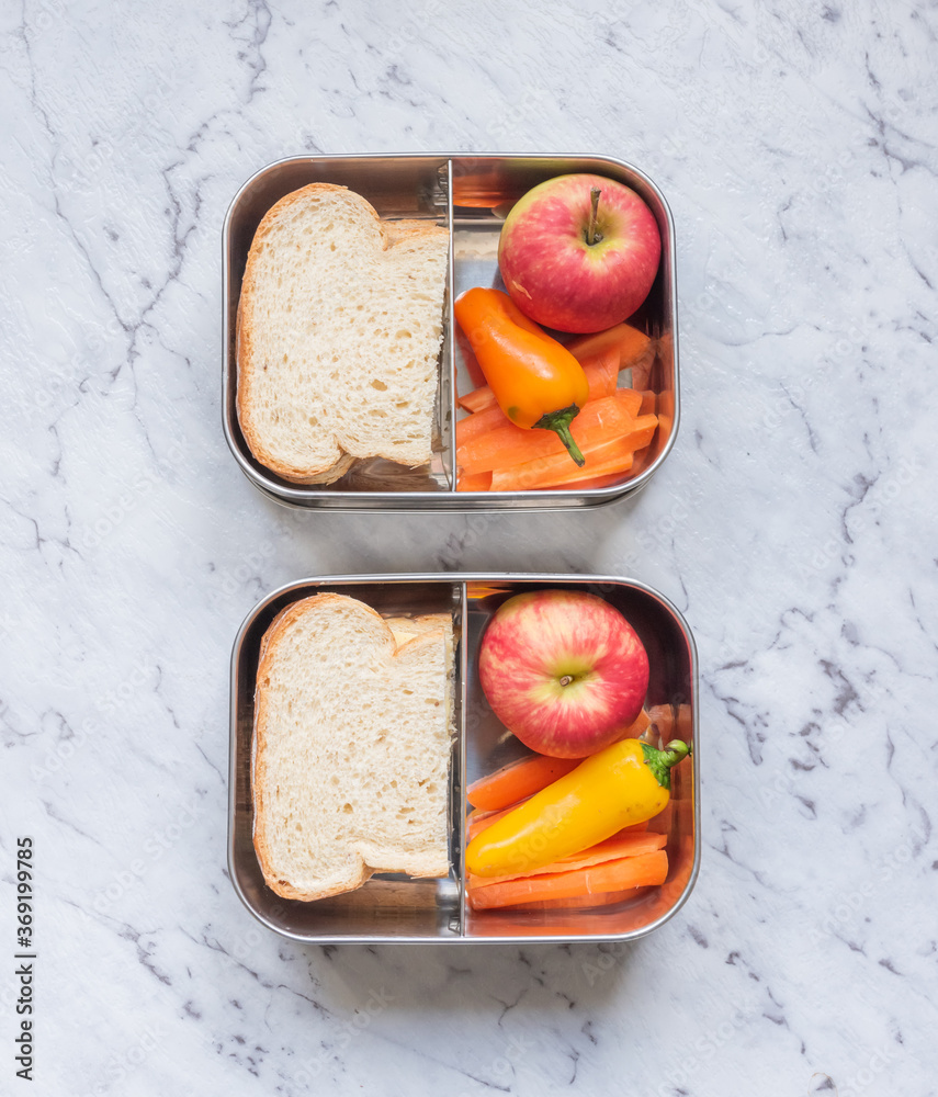 High angle vertical view of stainless steel lunch containers with healthy food, including wholemeal sandwich, apple, carrots and bell pepper on grey marble background (selective focus)