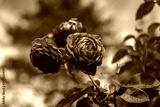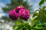 Pink rose flowers on a garden bed. Three buds on one stalk.