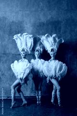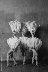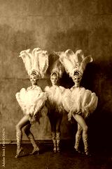 Three Women in cabaret costume with pink feathers plumage.