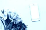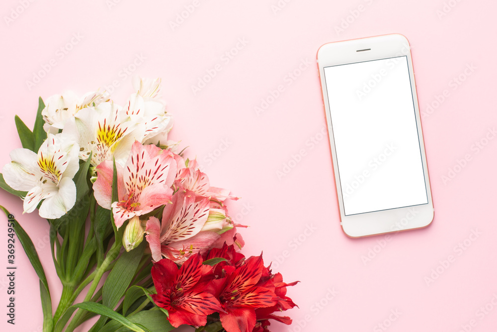Mobile phone and white and pink flower Alstroemeria on a pink background