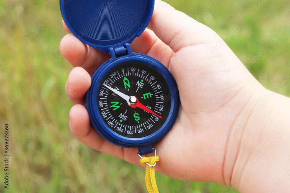 Old classic navigation compass in hand on natural background as symbol of tourism with compass, travel with compass and outdoor activities with compass