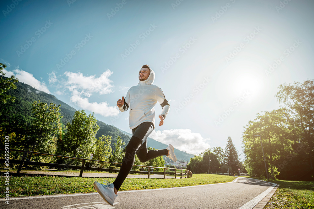 Athletic man is training at an outdoor gym near the mountains.
