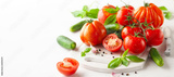 Healthy food concept with fresh ripe tomatoes, cucumbers, radish, basil, garlic and spices. Clean eating