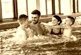 Smiling family of four having fun and relaxing in indoor swimming pool at hotel resort.