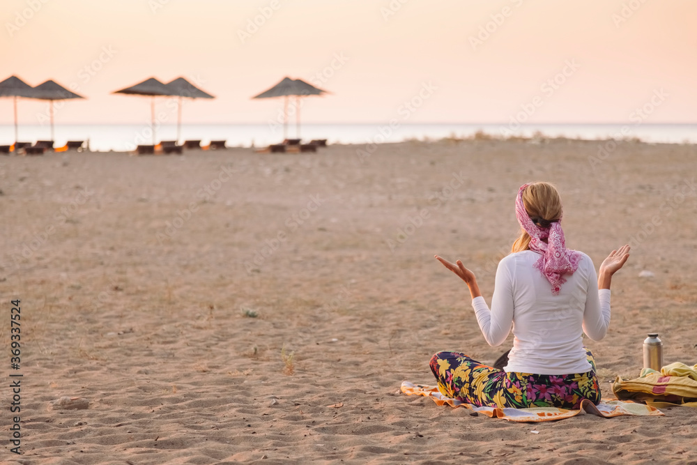 Woman relaxing on beach at sunrise in Cirali, Antalya Province, Turkey, Asia