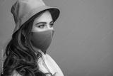Woman wearing stylish protective blue face mask, trendy bucket hat. Fashion accessory during quarantine of coronavirus pandemic. Close up studio portrait. Copy, empty space for text
