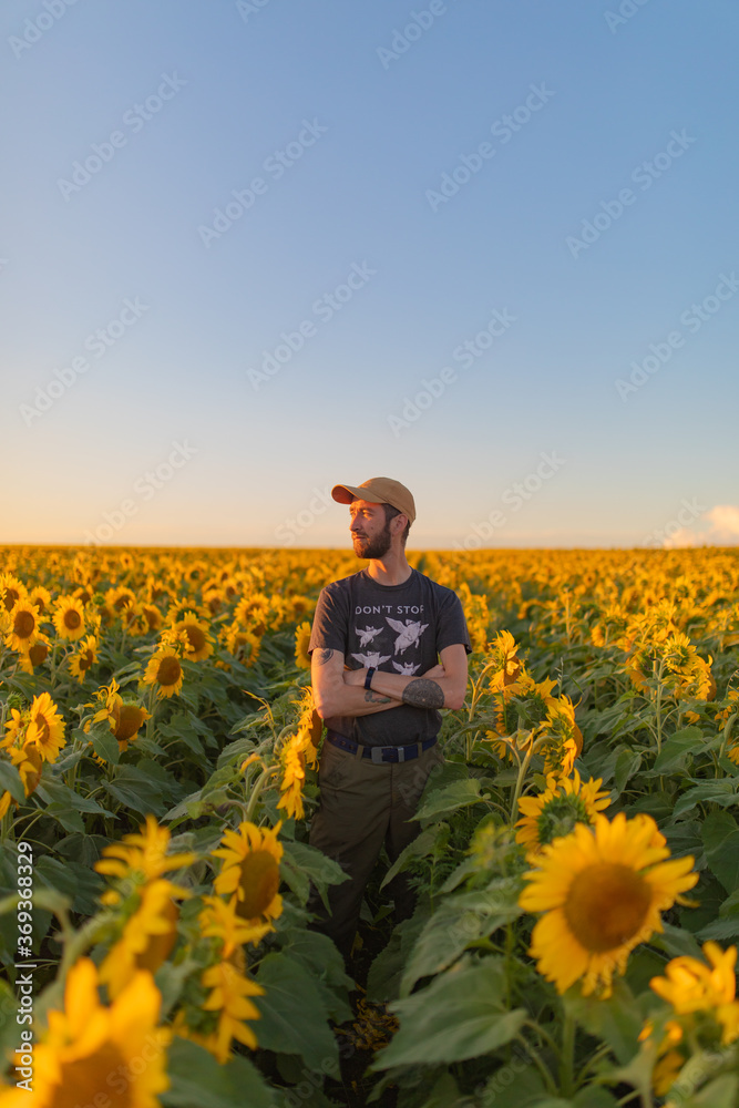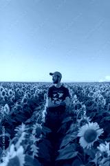 A young man in a dark T-shirt stands in the middle of a field with sunflowers and looks into the distance