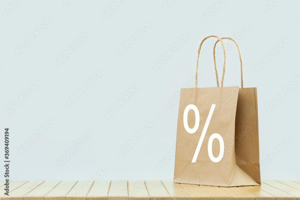 One buff plain paper carry bag with percentage sign on grey. Delivery service of goods and grocery, shopping courier. eco friendly packaging, plastic free takeaway. Shopping and sale. Copy space