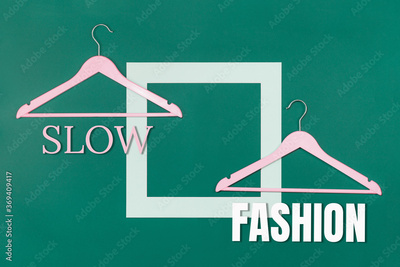 Slow Fashion text and two empty coat hangers on green background. Sustainable approach to manufacturing and eco-friendly anti-consumerism concept. Conscious buying awareness. Copy space