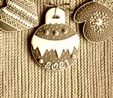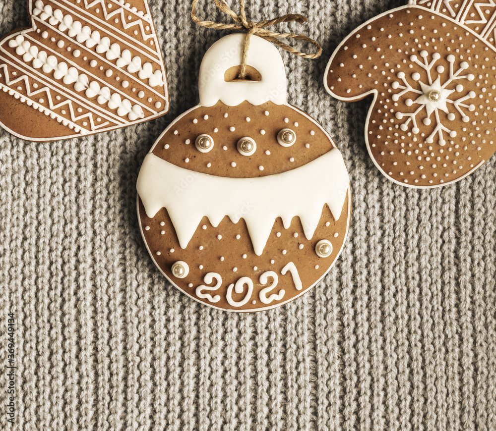 Homemade gingerbread on knitted woolen fabric background