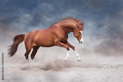 Beautiful red horse running on desert storm