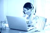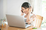smiling asian girl student studying online using laptop and listen music sitting at home