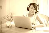 smile asia girl using gray notbook or laptop and wearing headset learning online