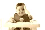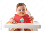 Cheerful baby child eats food itself with hands. Portrait of happy dirty kid boy in high chair and messy around.