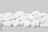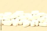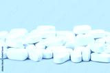 Medical banner of many white capsule tablets or pills on blue table. Close up. Healthcare pharmacy and medicine concept with copy space Painkillers or prescription drugs consumption