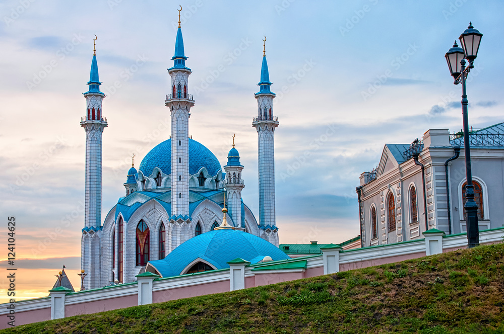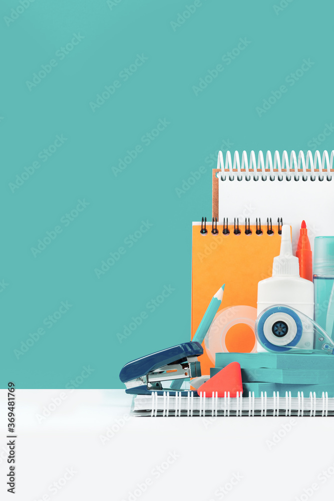 Group of office and school yellow orange and teal stationery on desk. Various supplies for back to school or education and craft concept. Selective focus. Copy space