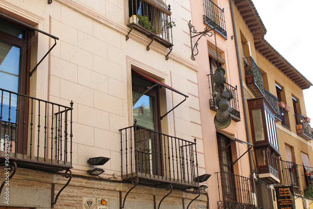 Facades of traditional buildings with old pans hanging from wall, in Toledo.