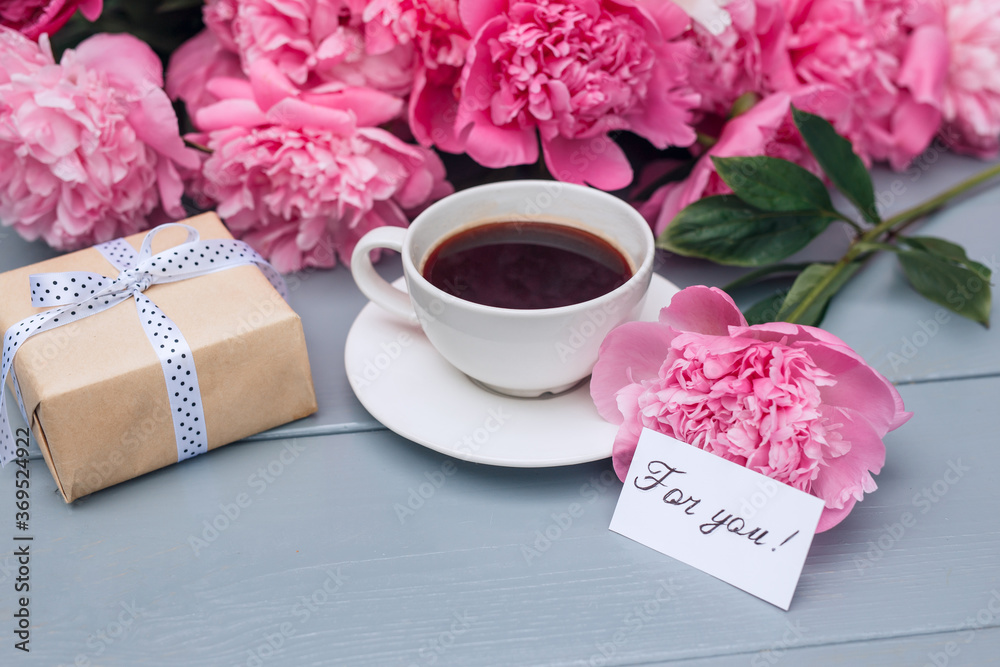 Morning coffee cup, pink peony flower and blank greeting card on wooden background. Flat lay.