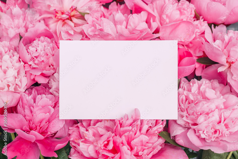 Wedding invitation with peonies flowers, top view . Mothers Day