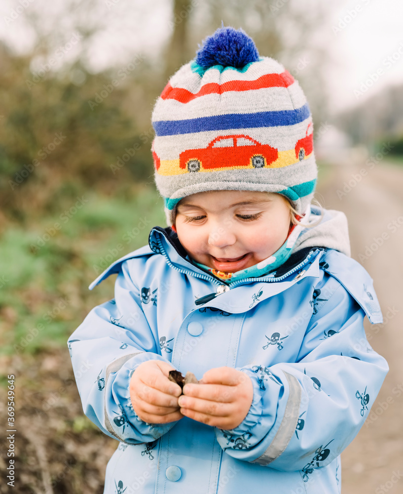 Toddler girl playing with acorn