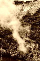 Rocky cliffs and steam in Wairakei Thermal Valley