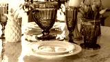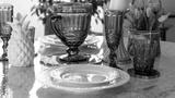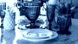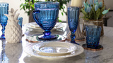 Light dining room interior with a large window. Marble table with oak base. Serving with white dishes and a blue accent. Blue glasses, flowers.
