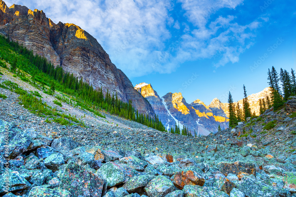 Morning Sun Lights up the Valley of Ten Peaks at Moraine Lake Along Consolation Lakes Trail in Banff National Park
