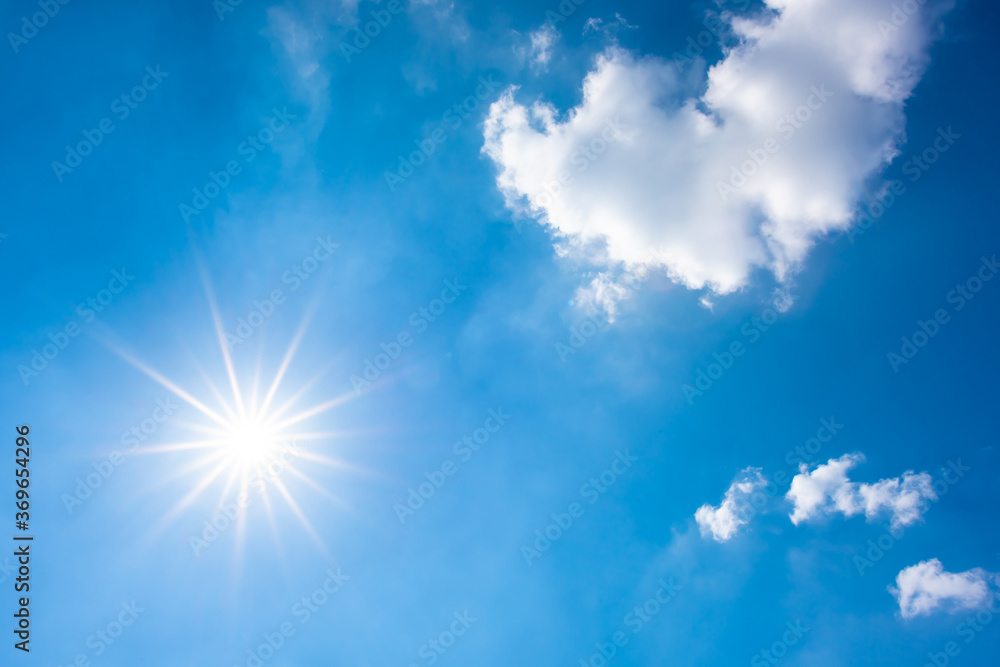 Hot summer or heat wave background, glowing sun on blue sky with clouds