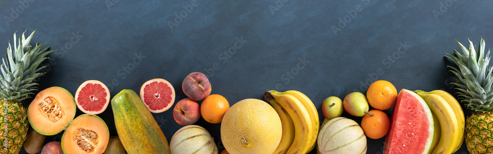 Variety of fresh seasonal fruits on rustic background, panoramic view, copy space