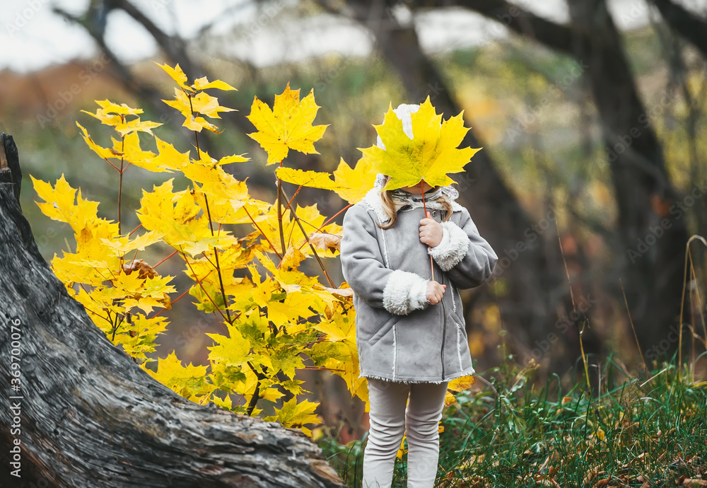 Small girl hiding her face with maple leaf near the large stump in the autumn forest