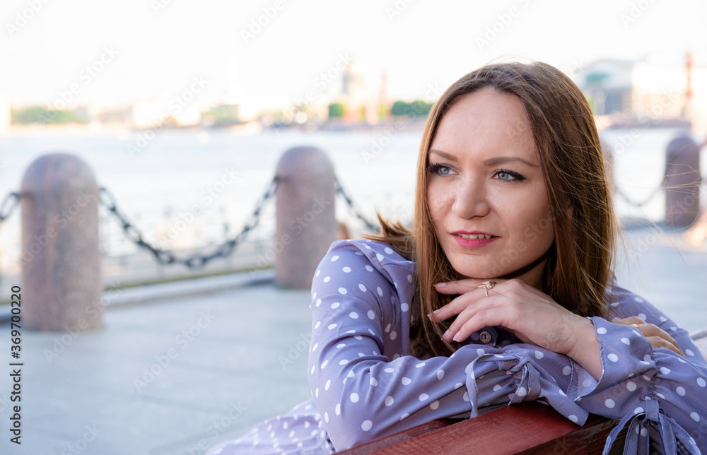 woman with red hair in a gray dress sits on a bench on the embankment in the summer in Saint Petersburg