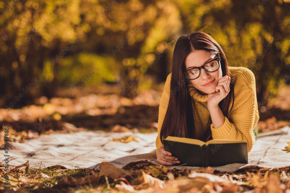 Photo of positive girl rest relax in autumn forest park lawn lying checkered plaid blanket read interesting book wear yellow color pullover