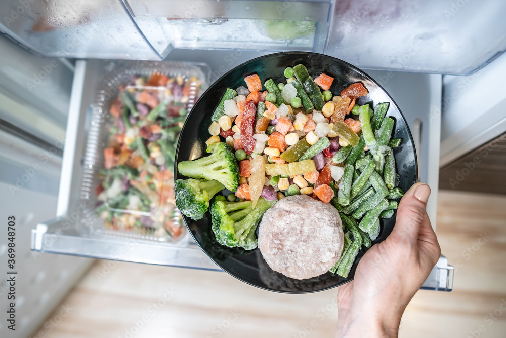 Hands are taking a plate of frozen food out of the freezer of the fridge. Concept of storing ready made food and saving time on cooking dinner