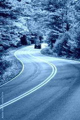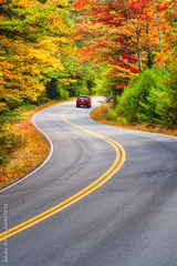 A red car driving through winding road with beautiful autumn foliage trees in New England