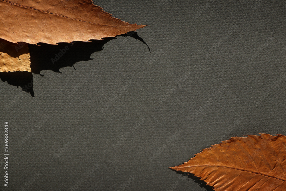 Yellow and gold leaves on textured dark grey background, leaves casting deep shadow. Autumn mood background for custom notice text.
