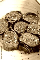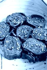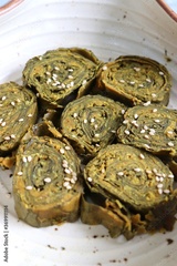 Alu Vadi or Patra or colocasia leaves roll is a popular Indian steamed snack. Paatra made using or taro leaves, coconut, gram flour and spices. Garnished with sesame seeds. Copy space.