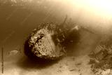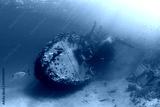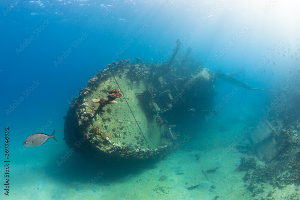 Wreck lies at the bottom illuminated by the rays of the sun breaking through the water. Red sea