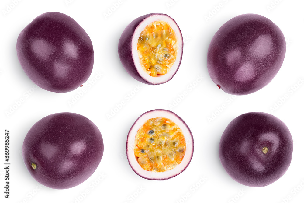 whole passion fruits half isolated on white background. maracuya with clipping path. Top view. Flat lay