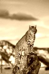 BOBCAT lynx rufus, ADULT STANDING ON ROCK, LOOKING AROUND, CANADA
