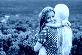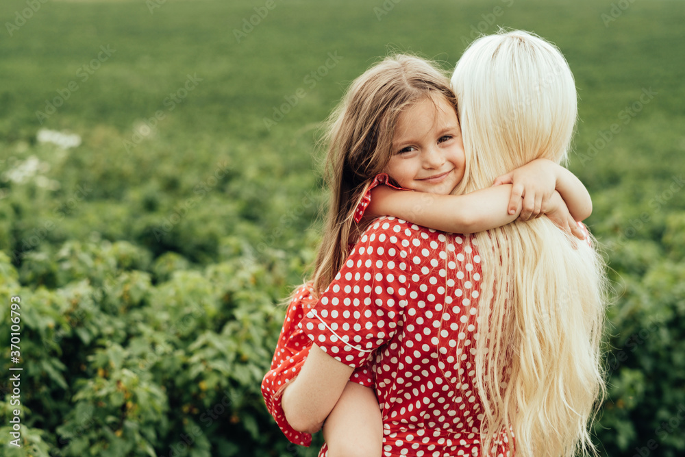 Young Mom with her Little Daughter Dressed Alike in Red Polka Dot Dress, Having Fun Time in the Field Outside the City, Motherhood and Childhood Concept