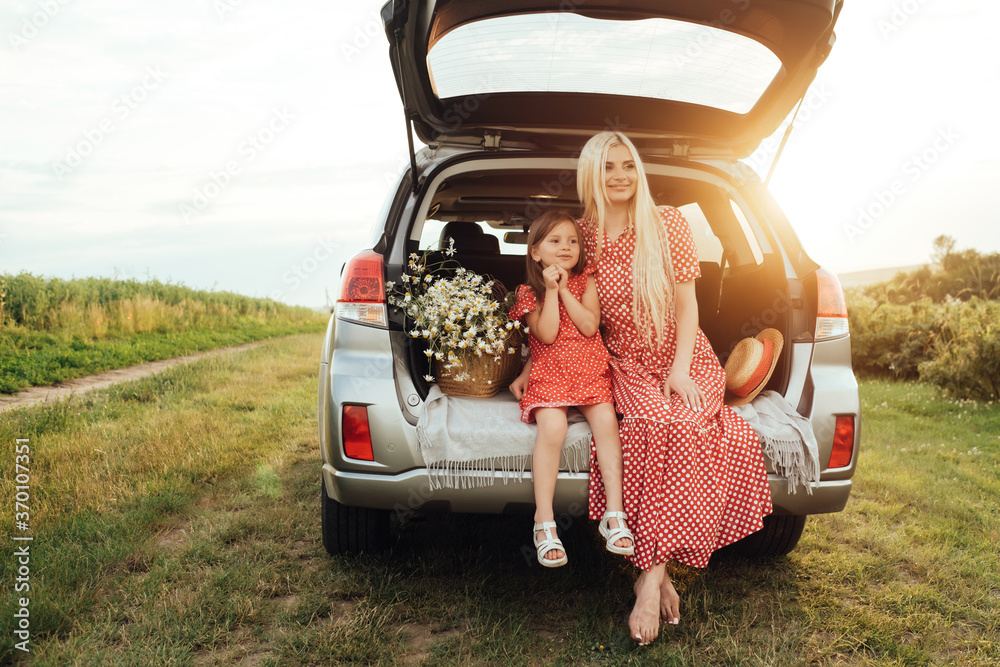 Young Mom with her Little Daughter Dressed Alike in Red Polka Dot Dress, Sitting in a Car Trunk in the Field, Road Trip Picnic Concept