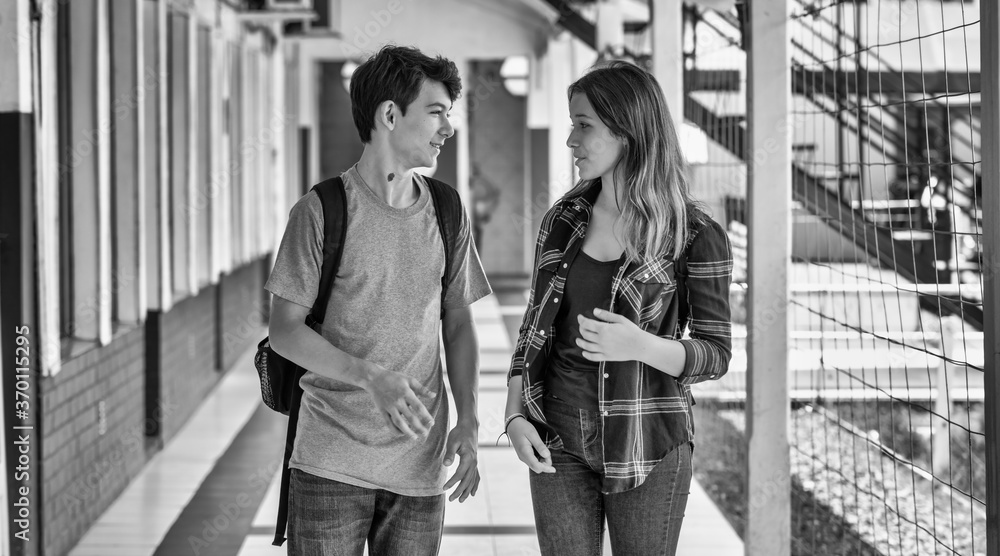 Two caucasian teenagers friends happy returning to school speaking along the hallway. Back to school concept
